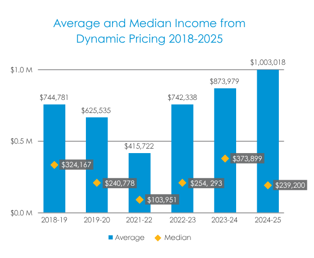 In 2024-25, the average incremental income from dynamic pricing per organization was over $1 million. In addition to this substantial average, the per organization median was roughly $240,000.